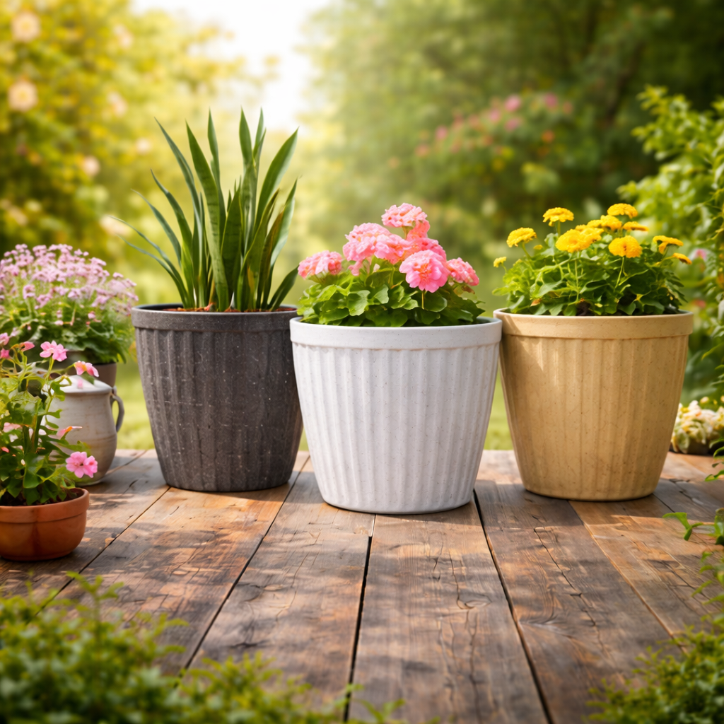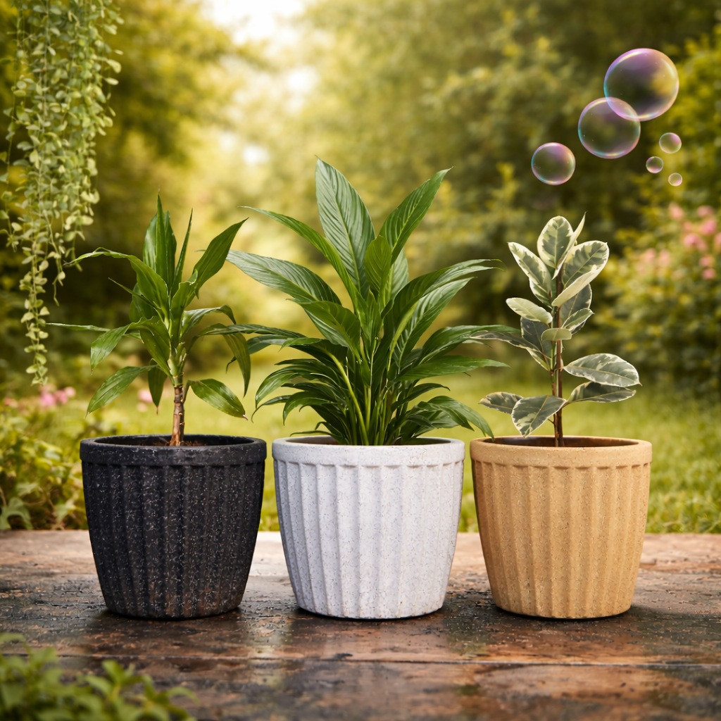 Premium quality straight line round plastic planter pot manufactured by M Three Plasto Pvt Ltd, Nagpur. This durable and stylish pot is perfect for indoor plants, outdoor gardens, nurseries, and landscaping projects.